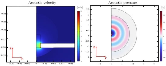 At the boundary where the acoustic source is located, the boundary condition was set to an acoustic volume velocity with a unit value. In Figure 8, the colormap of the acoustic pressure and acoustic velocity are reported for an operating frequency of 400 Hz. From the analyses of the velocity field near the wall region of the orifice, we can highlight the region of greatest viscous stress for the fluid which will be responsible for triggering the nonlinear phenomena (Figure 8, left). Meanwhile, the right panel of Figure 8 highlights the spherical shape of the acoustic pressure field, providing a clear indication of monopole-like radiation outside the hole. This behaviour becomes more pronounced at lower frequencies.