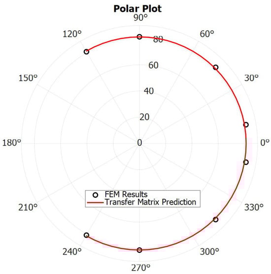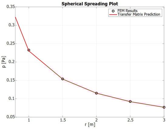 Figure 9 and Figure 10 report a comparison of the sound pressure outside the orifice in more than one point of the external domain placed on a different angle and radius. One can also note a perfect spherical wave shape (Figure 9). The theoretical–numerical agreement is also evident in the spreading of a spherical wave with distance r, which follows the well-known decay law, as in Figure 10. These results prove that the assumption of a point monopole made above well suits the problem without suffering losses in accuracy.