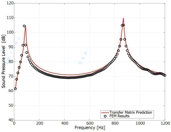 Comparison between numerical simulations and the Transfer Matrix Approach reported in terms of Sound Pressure Level (1 m, 90°) against the frequency axis.