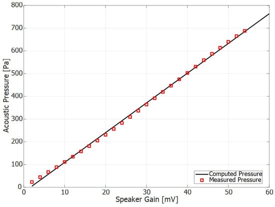 The cavity resonance of the speaker’s back cavity refers to the volume of the speaker’s enclosure (Figure 5). To determine this resonance, a measurement was performed using a logarithmic sweep signal. The acoustic pressure inside the cavity was recorded by a microphone synchronized with the signal generated by the speaker. By applying an FFT to the recorded signal, the resonance frequency of this coupled cavity–speaker system was identified. As shown in Figure A1, the frequency corresponding to the highest acoustic pressure within the cavity is 189 Hz. Consequently, according to Equation (2), at this frequency, the volumetric velocity generated by the speaker reaches its maximum.