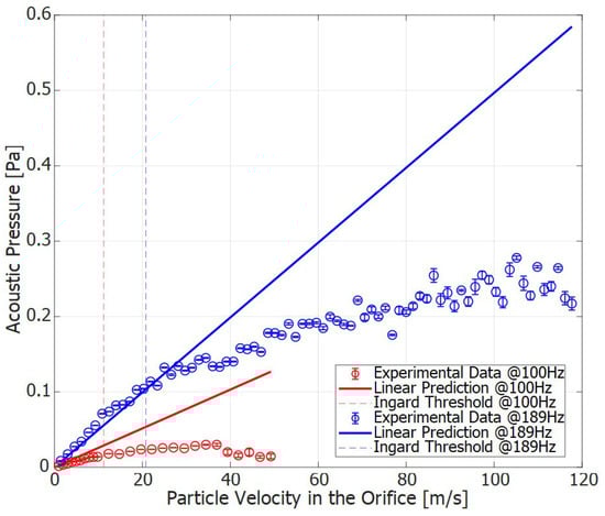 The experimental campaign began by setting the frequency to the resonance frequency of the speaker’s back cavity (189 Hz) to maximize the volume velocity output. In Appendix C, the procedure to assess the resonance frequency is reported. Subsequently, additional tests were conducted at 100 Hz to demonstrate the effective functionality of the model. The amplifier gain was then adjusted to enable the speaker to output a pure tone at the set operating frequency, varying between 0.1 and 54 mV. The two microphones detected the pressure within the speaker cavity, allowing the volume velocity and the acoustic pressure in the external field to be determined, as shown in Equation (2). The latter measurement was crucial for analyzing and observing nonlinear phenomena induced by the interaction between the increasingly intense acoustic field (as the amplifier gain increased) and the narrow region created by the presence of the hole. In the first cycle of the test, the pressure in the back cavity was measured to check if nonlinear effects related to the speaker (such as possible distortion) occur when the pressure amplitude increases. As reported in Figure 12, a perfect linear behaviour of the speaker with the supply voltage was found. The high level of acoustic pressure achieved is justified by the fact that the back cavity of the speaker is characterized by a volume of . Therefore, important considerations can be made looking to the graph in Figure 13. Here, the experimental acoustic pressure is reported against the acoustic particle velocity . This latter parameter was assessed through the Transfer Matrix Approach once the boundary conditions of the system were known . This parameter serves as a reference for assessing the onset of nonlinear phenomena. As highlighted by Ingård, when the velocity within the hole becomes significantly higher (), nonlinear effects begin to play a substantial role. The aim of this work has been to develop a setup that allows for the experimental evaluation of the speaker velocity and the resulting velocity within the hole using a completely acoustic-based system (a speaker and two microphones, without PIV or other instruments). Additionally, nonlinearities are observed here for the first time in a free-field environment within a semi-anechoic chamber, thus eliminating the influence of reflections from external surfaces. As demonstrated in numerical simulations, it is also possible to rule out the contribution of reflections from the metal plate surrounding the hole, since the predicted acoustic field exhibits a monopole distribution, supporting the validity of this assumption. As it can be seen from Figure 13, good agreement was found between experimental data and the prediction in the linear regime. Furthermore, Ingård’s formulation of the velocity threshold, Equation (2), was verified through the experiments for both the selected frequencies, 100 Hz and 189 Hz. The measurements were repeated four times for each frequency, allowing the experimental data to be represented with error plots that account for both the mean and the standard deviation of the four measurements. Notably, in the nonlinear regime, the data dispersion shows greater deviation. This increased variability is attributed to the high sensitivity to fluid dynamic conditions, such as local vortex formation and unidirectional flow, which can vary stochastically. In contrast, in the linear regime, where no phenomena alter the wave propagation in the free field, the data dispersion is considerably more controlled, as expected. Therefore, the discrepancy between the theoretical model and the experimental results in the nonlinear regime can provide an indication of the acoustic energy that is partially converted into rotational kinetic energy, forming vortices exiting the orifice and partially entering translational kinetic energy associated with the flow velocity, which will be referred to as a synthetic jet.