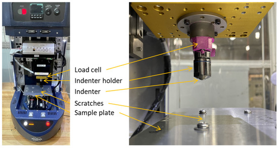 Scratch tests were performed using a Bruker TriboLab UMT machine (Billerica, MA, USA), as shown in Figure 1. The Bruker UMT TriboLab accurately measures both the indenter’s position (Z height, in mm) and the stage’s position (X, Y distance, in mm). The load cell in the Bruker UMT TriboLab records the frictional forces (N) and the applied load (N), which are then used to calculate the coefficient of friction (COF). Both positional and load measurements were recorded at a sampling rate of 1 kHz. The sample plates were secured to the TriboLab UMT stage using the four bolts illustrated, and the indenter was mounted in the indenter holder.