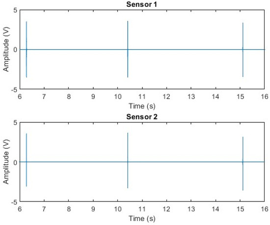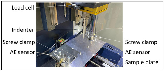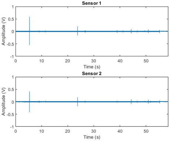 AE signals were recorded using a Vallens AE system equipped with LabVIEW data acquisition hardware. The AE sensors were linked to the data acquisition system (National Instruments, model PXIe-1078, Austin, TX, USA) via a high-speed digitizer (National Instruments, model DCPL2) and an amplifier (Vallen Systeme, model AEP3N, Icking, Germany) with a gain of 40 dB. The Vallens AE sensors F15a (Sensor 1) and R15a (Sensor 2) were used, each with a frequency response detailed in their product data sheets. Both sensors are of the dimensions 22.4 mm height with a diameter of 19 mm; they weigh 34 g and were clamped with similar force.