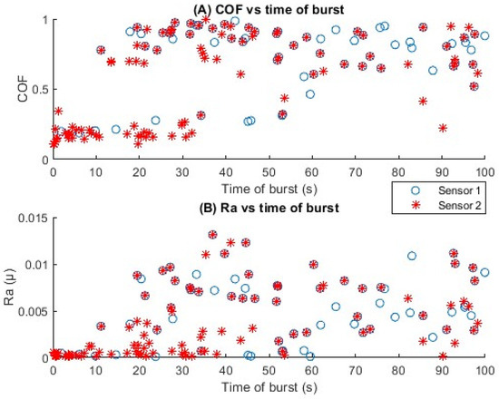 Characteristics of individual AE bursts were analyzed in relation to the COF and Ra at the specific location where the burst was detected to observe how the bursts changed with worsening damage. Numerous authors have previously investigated burst characteristics [45].