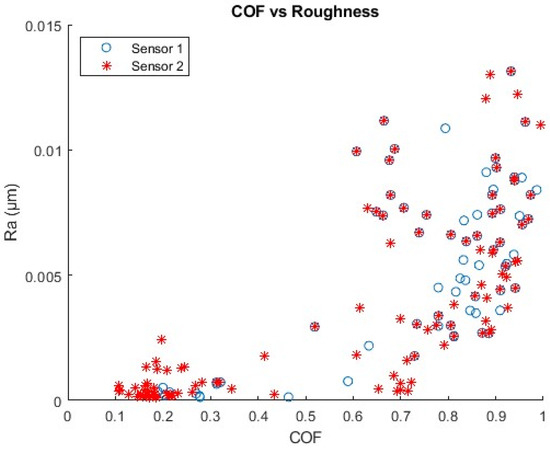 Relationship between the COF and Ra at the instance an AE burst was detected, for each detected burst, for both Sensor 1 and Sensor 2.