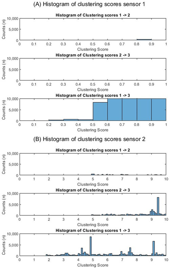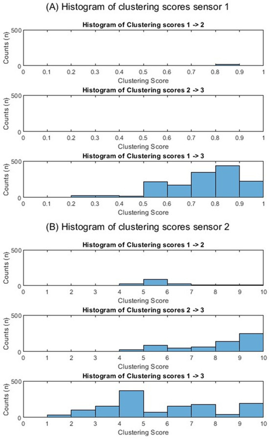 In the 2D AE space, there are 2704 possible combinations of AE features, whereas in 3D space, there are 140608 possible combinations of features. In this research, we are searching for the combinations with the lowest clustering score and highest separation. A low clustering score represents high cohesion (low intra-cluster distances), which is measured as the mean distance from each point in the cluster to the centroid. On the other hand, high separation (high inter-cluster distances) is measured as distances between the three centroids. Histograms of the clustering score have been employed to summarize the data, and subsequently, combinations of good features have been investigated/reported.