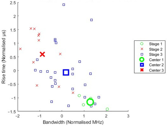 Cluster analysis has been explored in this field. Li et al. [31] have used clustering on the skewness normalized time-frequency matrices against the variance of the normalized time-frequency matrices to discriminate between “normal” and high roughness samples of Inconel in milling applications. Rastegaev et al. [32] proposed a method for simplifying the presentation of clusters of results when wear accumulates chronologically; however, as a stochastic phenomenon (and as evidenced by this research), this may not always be applicable. Pomponi and Vinogradov [33] proposed a real-time approach to clustering the data from AE bursts in fatigue testing, with linear data, in the AE feature space (kurtosis vs. median frequency), using an adaptive sequential k-means algorithm. Van Steen and Verstrynge [34] used hierarchical clustering to correlate damage in concrete beams to peak frequency. Ichenihi et al. [19] explored the clustering in terms of both well-established and directly measured AE features as well as other derived features. Shimamoto et al. [35] employed machine learning techniques to select features and classify AE into three clusters using a k-means clustering algorithm, focusing on peak frequency, centroid frequency, and peak amplitude. By analyzing the AE features within these clusters, they attributed the degree of concrete damage to the clusters as the AE feature characteristics varied among them. Having clustered the data, Shimamoto et al. [35] identified the most important features to be rise time and centroid frequency when clarifying the compressive fracture behavior in concretes. In this work, these clusters come from the measured COF as opposed to direct damage measurement. Qiao et al. [36] studied AE to monitor the failure process of thermal barrier coatings. Cluster analysis of the signal characteristics in the frequency–amplitude parameter space revealed three distinct types of AE signals during indentation testing. These were classified into low–low, low–high, and high–high amplitude–frequency space clusters, each associated with different failure modes in the coatings.