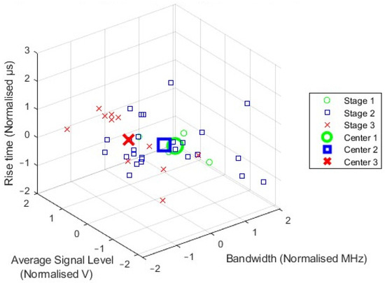 Conversely, with Sensor 1, count rate and log count rate are the only features for Sensor 1 to discern a difference between stages 1 and 3 and stages 2 and 3, but not 1 and 2. Log skewness is the only parameter to indicate a difference between stage 1 and stage 2, but it does not indicate any other significant change. Moreover, skewness itself is the only parameter to find a difference between stage 2 and stage 3, but no other stage. Log rms, log shape factor, log impulse factor, log maximum (peak) amplitude, log clearance factor, log power, log root amplitude, and log margin all show a difference only between stage 1 and stage 3.