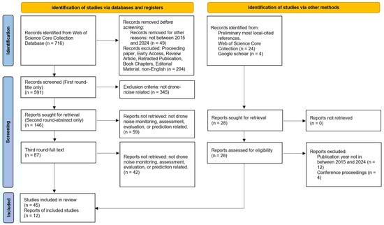 This review establishes essential exclusion and inclusion criteria throughout multiple rounds of the screening process. First, the timestamps of selected studies were limited to those published between 1 January 2015 and 1 January 2024. Additionally, only English-written, peer-reviewed journal articles were included. From the first round to the third round, the authors selected studies relevant to drone noise monitoring, evaluation, assessment, and prediction, considering different levels of completeness. In the first round, the authors examined only the titles. In the second round, they reviewed the abstracts. The final round of screening involved a full-text review.