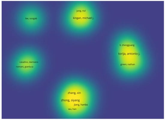 Figure 2 presents a density visualization of co-authorship using fractional counting. The minimum number of documents per author was set to 3, and the weight of the links was fractionalized based on the number of co-authors of each study. Some nodes in this network are not connected to each other. Five clusters are identified in Figure 2 based on the predefined threshold. For example, two groups led by Zhang, X. and Torija, A. are disconnected, indicating no direct collaboration or relevance between their studies.