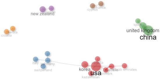 Figure 3 presents six clusters of countries. The first cluster comprises China, the United Kingdom, and Spain. The second cluster includes the United States, South Korea, Kazakhstan, Canada, Denmark, Australia, and the United Arab Emirates. The third cluster consists of Germany, Italy, Switzerland, and Belgium. Notably, Clusters 2 and 3 are the only groups that show collaboration between groups of countries. Similarly, Figure 4 presents a collaboration network by institutions. The largest cluster is centered on the Hong Kong University of Science and Technology (China), consistent with Table 4.