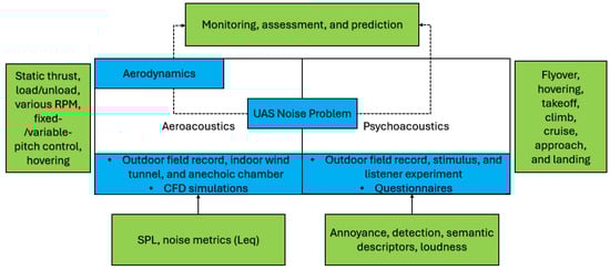 Aeroacoustics is commonly associated with aerodynamic analysis, which considers various types of rotor/propeller design, control, and operation of UAS platforms. These analyses are usually conducted in outdoor/indoor experiments or computational fluid dynamics simulations.
