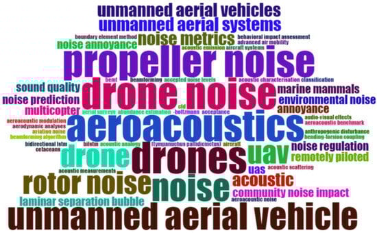 Figure 6 presents an author keyword cloud generated based on the frequency of author keywords. There are a total of 116 occurrences of 50 different keywords. The top ten author keywords by frequency are ‘aeroacoustics’ (7), ‘drone noise’ (7), ‘drones’ (7), ‘propeller noise’ (7), ‘noise’ (6), ‘unmanned aerial vehicle’ (6), ‘drone’ (5), and ‘rotor noise’ (5).