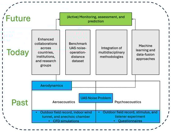 Extensive research has demonstrated the feasibility and cost-effectiveness of a data-fusion-based approach in traditional manned aircraft noise prediction [81,82,83]. Similarly, this approach could benefit UAS noise impact assessment by leveraging telemetry data broadcasted by UAS. For instance, the FAA mandates that sUAS operating in the USA must be equipped with remote identification, also known as Remote ID, which includes time-location and fleet information [84]. Despite the limitations in current UAS surveillance capabilities, these advancements will highlight the potential for data-fusion applications in future active UAS noise monitoring, assessment, and prediction. A roadmap is presented in Figure 7.