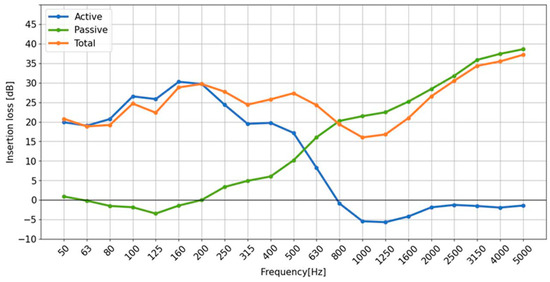The obtained results are consistent with the assumptions. Active attenuation (understood as the attenuation obtained as a result of the operation of the ANC system) dominates up to 500 Hz, above which passive attenuation begins to dominate (understood as the attenuation obtained through the design of the earphone, which acts as a natural sound barrier). Total attenuation, which is a combination of active and passive attenuation, remains high throughout the entire tested range.