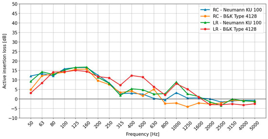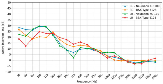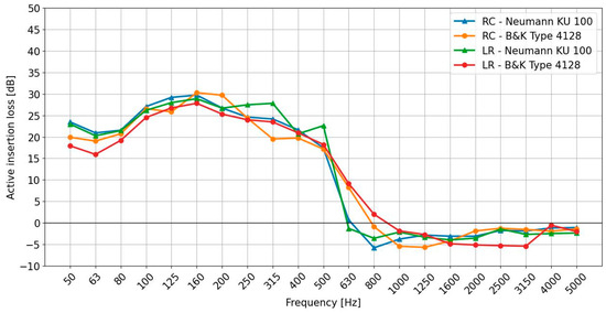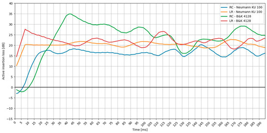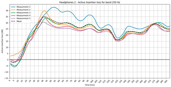 Figure 11 shows the active attenuation as a function of time for the 250 Hz band, obtained for HP2 headphones under four measurement conditions: in the reverberation chamber (RC), in the listening room (LR), using two models of artificial heads (Neumann KU100 and B&K Type 4128). The results reveal noticeable differences. Measurements obtained in the listening room demonstrate higher initial values of active attenuation, whereas in the reverberation chamber, the initial active attenuation values are close to zero.