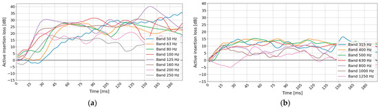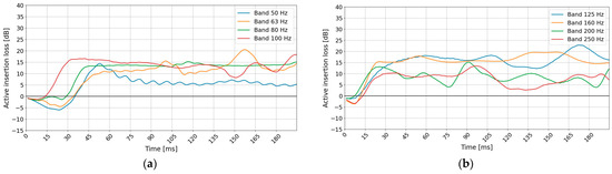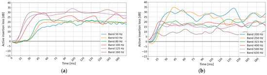 The pink noise measurement was performed to observe changes in active attenuation over time when the signal was turned on. After initially analyzing the waveform graphs, it was decided to use a frame length of 256 samples with a window shift of 64 samples (75% overlapping). These settings provide a time resolution of 1.3 ms, which is sufficient for observing changes in attenuation over time when measuring with pink noise. Based on the obtained characteristics, the convergence time was determined as the time from turning on the signal to achieving the active attenuation value in a given 1/3 octave band. This approach was taken due to difficulties in determining the moment of system stabilization. The time from turning on the signal to the arrival of the acoustic wave at the test dummy head was also considered.