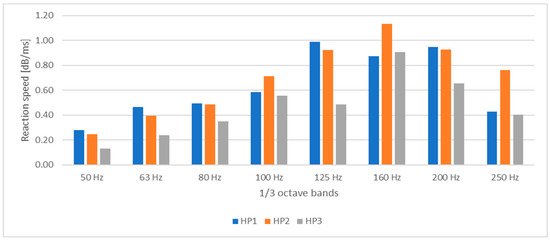 For the HP1 headphones, the reaction speed could be determined for the largest number of bands, and for the HP3 headphones, for the smallest number of bands. Analyzing the results in individual bands, it can be seen that, in many cases, the HP1 and HP2 headphones achieved higher convergence time values than the HP3 headphones. However, the HP1 and HP2 headphones are characterized by significantly higher active attenuation values. This results in lower reaction speed values for the HP3 headphones. This means that the active reduction system in the HP3 headphones reacts more slowly to appearing noise. This can be seen in more detail in the comparison of reaction speeds for various headphones, which is presented in