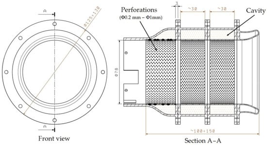 A spectral analysis was conducted on the recorded signals in order to determine the sound spectrum profile of a running engine and identify the tonal noise components that make major contribution to the overall noise and to later to evaluate for which frequency bands the silencer would be the most effective. Because the engine runs at high speeds, the presence of high frequency tonal components is observed on the spectrum. Due to dimensional and construction restraints, such high frequency tonal components will be hard to attenuate, so the present silencer configuration was designed and integrated to operate on mid frequency bands (2–10 kHz). Based on the spectral analyses performed for both the far-field acoustic signals (microphone polar array) and the near-field signals (microphones located near the inlet and exhaust), it was found that the source with the most significant contributions to overall noise came from the engine’s compressor (revealing gas-dynamic phenomena corresponding to BPF and 2x BPF). Thus, it was found that at the intake level, the main noise contribution comes from the compressor components that are at high frequencies, while at the exhaust level the noise mainly comes from the combustion chamber, with increased levels of broadband low frequencies (up to 2 kHz). The spectra in Figure 9b show that the noise on the inlet side is broadband noise, and an appropriate approach would be to widen the absorption well (similar to the solutions proposed in [], where various powders were placed in an acoustic liner [,]). Taking into consideration that low frequencies are hard to attenuate with such a small silencer, the optimal silencer aims to attenuate mid frequency broadband noise (2–7 kHz), along with contained tonal components, on the exhaust side.