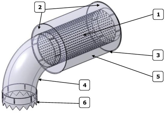 For the exhaust area, since the gases have a high temperature (~200 °C), a solution (Figure 7) consists of placing a perforated tube (1) between two side covers (2), with the system being closed by a rolled sheet (3). The assembly on the engine will be made by clamping (using a collar), and a mechanical fastening to the drone structure will also be fitted. An elbow (4) will be provided at the end of the resonator to divert the gases away from the sensitive areas (drone electronics) and a chevron (6) will be placed in the exhaust extension (if appropriate).