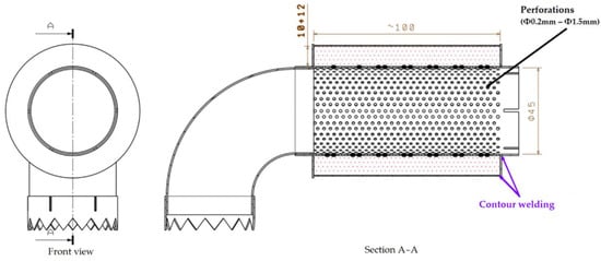 Several sections were serialized and the following notations were used: HW—“hard wall”, solid unperforated wall to simulate a straight pipe section; A1—inlet fitting that was provided with HW; T1—1st perforated sheet (AISI 304) or T2—2nd perforated sheet (316L); A2—inlet section without internal structure, only 10 mm in height; A3—inlet section with honeycomb-type internal structure (10 mm cell, 10 mm in height);