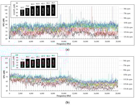 Micro turboshaft noise measurements: (a) intake spectra (microphone at 200 mm); (b) exhaust spectra (microphone at 200 mm).