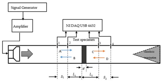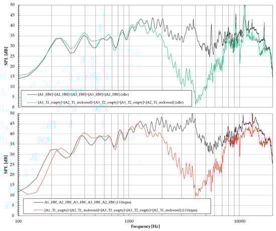 Several approaches were identified to estimate the performance of these liners. The transmission losses, for which the attenuator can be inserted into the transmission loss (TL) tube [], can be derived from measurements of the differences between the spectra recorded before and after the test specimen (similar to Figure 10). The computational relationships for the TL are identified in [].