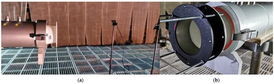 The “Insertion Loss” measurement option was selected for this analysis. This method involves testing the sample in an anechoic chamber with one end oriented towards the Kundt tube and the other end exposed to the ambient environment. This configuration allows for a more accurate assessment of the performance of the solution after its installation by comparing the results between the rigid-wall and liner solutions. Figure 11 illustrates the experimental setup within the anechoic chamber. For the directivity measurements, five microphones were placed at angles from 0 to 60 degrees, with a 15-degree spacing between each microphone.