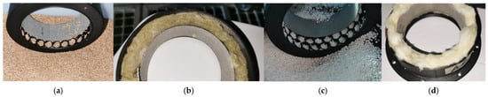 Materials used to fill resonant cavities: (a) cork filling; (b) basaltic wool filling; (c) expanded polystyrene filling (Φ1 mm); (d) glass wool filling.