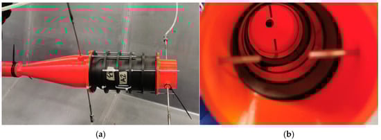 Regarding pressure losses, tests were conducted on the 4 + 1 liner configuration (~175 mm liner), allowing for the correlation of these aerodynamic aspects with turbine power loss. The configuration used to measure the pressure drop is shown in Figure 15, where static and total pressure probes were placed at the inlet and outlet, respectively, to measure dynamic pressure. A divergent section was also used, which allows the compressed air (from the reservoir) to expand to a pressure close to atmospheric.