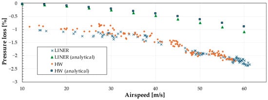According to Neihguk et al. [], the total pressure drop over a section of the flow (pressure drop as a result of the porosity of the acoustic liner + base pressure drop) can be calculated from the pressure dynamics, and, based on an experimentally determined coefficient, the relation for the reported pressure drop can be written using relation (17):