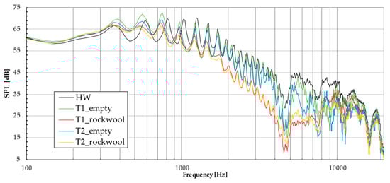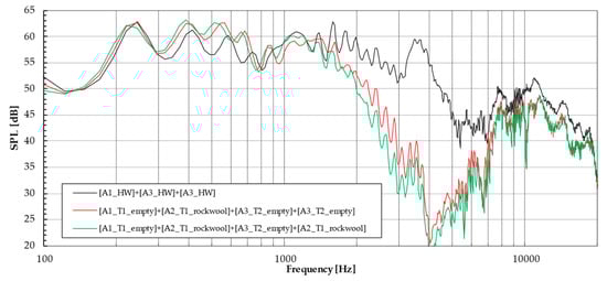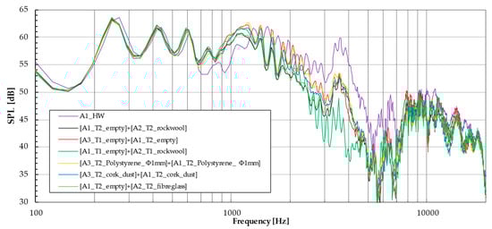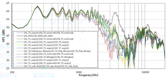 In order to highlight the noise reduction capabilities for certain frequency bands, the data shown in Figure 17, Figure 18, Figure 19, Figure 20, Figure 21, Figure 22 and Figure 23 have been processed and are presented in the following tables as insertion loss. In this way, one can directly observe the effectiveness of placing the sections either separately or in different combinations. The results in these tables are obtained by subtraction from the OASPL (Overall Sound Pressure Level) for perforated infill-perforated sheet combinations the HW (Hard Wall) obtained value, on a given octave band of interest. It should be mentioned that the initial design idea aimed to obtain a resonator that attenuates a center frequency (in this case, 4000 Hz, based the resonant cavity height–perforations parameters combinations), with filler material placed inside (at least at the inlet) to significantly broaden the absorption spectrum.