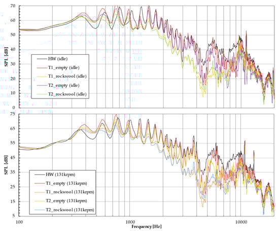 Large outlet section (100 mm) spectra—idle and 131 krpm noise.