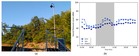 Figure 11b, the central hours of the day were excluded since they were related to extraneous activities within and around the circuit (highlighted in grey). Overall, the graph indicates an increase in hourly noise levels as activity increases during the summer and becomes more popular. Particular attention should be paid to the nighttime period when the noise levels remain consistent around Leq 50 dBA in June and even Leq 60 dBA in July–August. These values remain consistent past midnight, up to 02:00 when the kart drome finishes the races of the day.