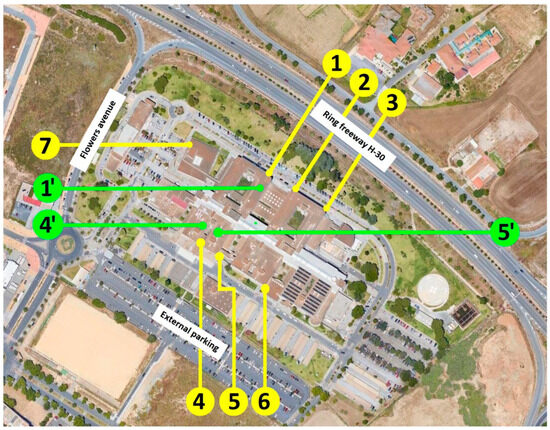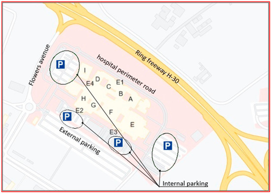 The province of Huelva is in the southwest of the Iberian Peninsula. The parcel where the hospital is located has approximately 12.5 ha, and its distribution is shown in Figure 1. In this figure, it can be observed that the hospital area is surrounded by the H-30 ring freeway (with high traffic density) to the north, by Flores Avenue to the west, by internal vehicle parking to the east, and by external vehicle parking to the south. The distribution of the different areas and buildings of the hospital can also be seen as well as a general view of the hospital, indicating its main modules differentiated by letters. The complex is made up of a main building and other adjacent buildings connected by corridors or galleries. The letter E with different numbers, that appear in this figure, represent the different entrances to the hospital: