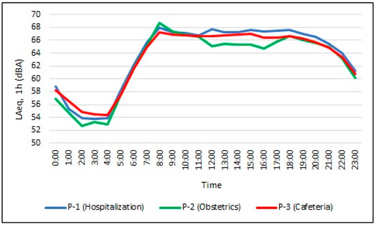 Daily evolution of LAeq,1h in the main façade of the JRJUH (points 1, 2, and 3).