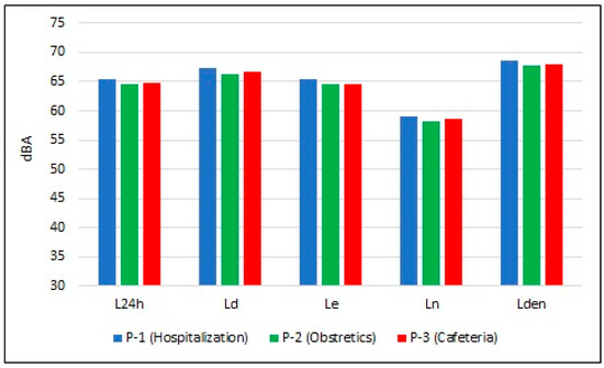 Figure 4 shows very similar values for all five indices (L24h, Ld, Le, Ln, and Lden) at the three points. By performing three comparative regressions, two by two, between the values of these indices, three R2 (coefficient of determination) of 0.9993 (Hospitalisation vs. Obstetrics), 0.9994 (Hospitalisation vs. Cafeteria), and 0.998 (Obstetrics vs. Cafeteria) were obtained. This means that there are no differences between the values of the indices and, therefore, that the three points of the main façade are subject to the same sources of noise. The software used for the statistical calculations were the EXCEL and the XLSTAT 2014 software, which work under Excel.