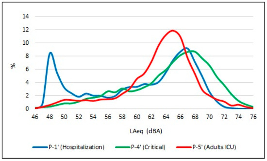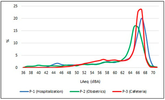 From the analysis of the frequency diagrams of points 4, 5, and 6 of the back façade (Figure 8), it can be clearly distinguished that there were different distribution functions for each point, although they followed similar patterns, consisting of two large peaks. The first peak would correspond to the noise source of the traffic on the perimeter road inside the hospital area, including the acoustic signals from the sirens of ambulances and mobile UVIS that access the Critical Emergencies. The second peak corresponds to the background noise from the back of the hospital, which would be made up of the conversations of hospital workers and visitors, the noise of ambulance doors, the noise of pulling out/putting in stretchers, people waiting at the access doors, etc. The three distribution functions are displaced instead of being very similar to each other, which could be due to the fact that the sound level metre of point 4 (Critical Care) is screened by the canopy of the access door to ER. This would attenuate by 2 dBA both sources compared to the diagram in point 5 (Adult ICU), whose sound level metre would not be shielded by anything. Finally, the sound level metre of point 6 (Laboratory), due to the shape of the back façade of JRJHU, is set back 16 m with respect to the perimeter road, which would cause an attenuation of 5 dBA on both noise sources. It can also be observed that the 10 s records are collected between both peaks of the distributions at 92–96%.