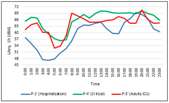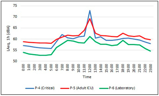 Measurement points 4, 5, and 6 correspond to the back façade. As in the main façade, the graph of the daily pattern of the equivalent levels of one hour (LAeq/1h) was obtained (Figure 6). From this graph, the first conclusion that can be drawn is that points 4, 5, and 6 follow the same pattern of daily evolution. This confirms that the whole back façade is affected by the same noise sources. Due to the shape of the rear façade of JRJHU, i.e., not continuous but rather scattered, the Laboratory façade is further away (16 m) from the perimeter road, which would cause an attenuation of approximately 5 dBA compared with the Adult ICU. This proves that the Laboratory graph is parallel to that of Adult ICU but about 5 dBA below it. In all of them, the minimum levels occur between 03:00 and 05:00, and the maximum levels at 12:00, with relative peaks at 07:00 and 18:00. Appendix A includes the graphs of the Daily evolution of LAeq/10s of the three points for the back façade.
