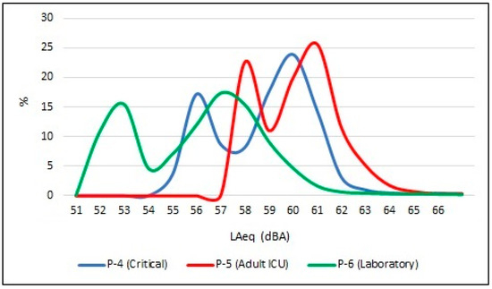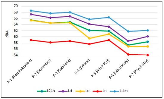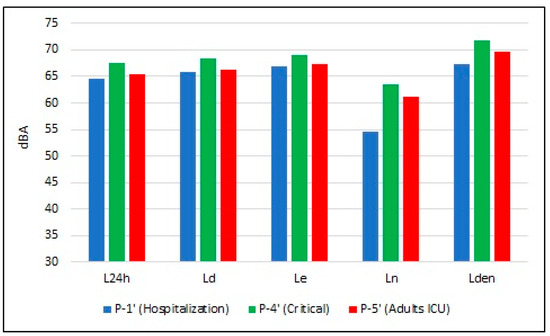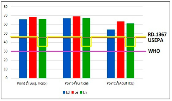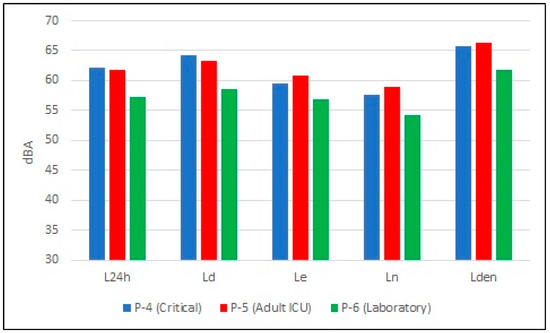 In Figure 7, the five indices (L24h, Ld, Le, Ln, and Lden) of point 4 (Critical care) and point 5 (Adult ICU) obtained practically the same values, with a coefficient of determination R2 of 0.91 from their linear regression, while the indices of point 6 (Laboratory) were between 5 and 6 dBA below the indices of points 4 and 5, with the coefficients of determination R2 of comparative regressions (Critical vs. Laboratory) and (Adults ICU vs. Laboratory) being 0.6454 and 0.7478, respectively. This indicates that the Laboratory indices are very different from those of the Critical and Adult ICU.