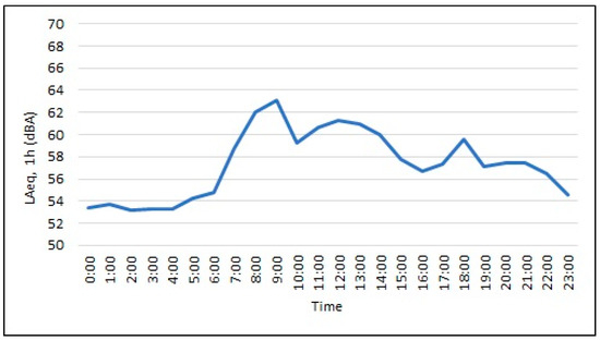 The graph of the evolution of LAeq/1h (Figure 9) shows a pattern like those on the main façade. This is due to its location on the side façade, where the H-30 ring road also exerts an influence, although at a longer distance, and, therefore, it is more attenuated; however, it is also influenced by the noise coming from the courtyard of the Psychiatry building, which is the place where the admitted patients of this specialty walk. Analysing the daily evolution of the equivalent levels of one hour (LAeq/1h), a much flatter graph is observed, with a less significant difference between the maximum level (63 dBA at 09:00) and the minimum level (53 dBA at 02:00–04:00 h). The Appendix A includes the graph of the daily evolution of LAeq,10s of the point for the side façade.