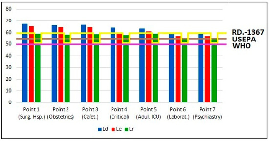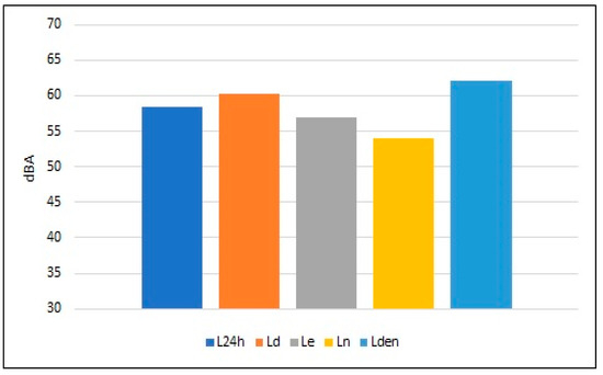 Figure 7 represents the L24h index for points 4, 5, and 6, as well as the values of Ld, Le, Ln, and Lden.