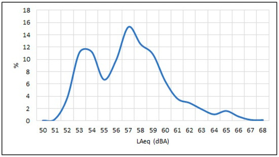 From the analysis of the graph of the frequency diagram in point 7 (Figure 11), a pattern with two prominent peaks at 53 and 57 dBA is observed. This indicates the existence of two main sources of noise. The highest peak corresponds to the traffic on the H-30 ring road, and the second peak corresponds to background noise.