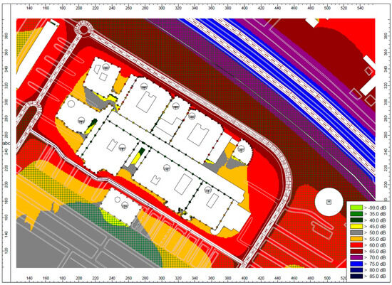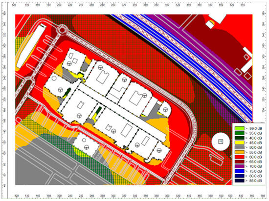 After digitising in CadnaA, all the buildings of the JRJUH area and the main noise sources (H-30 and PRs) with the data of Table 4, also considering the type of road pavement as well as its slopes and atmospheric conditions, and using a 1 × 1 m grid, the exterior noise maps were obtained at 4 m above the ground for the periods of day, afternoon, night, and Lden, such as the one shown for Lden in Figure 13. The maps obtained with CadnaA were previously calibrated with the results of the measurements before being considered final. The remaining noise maps are included as Material in Appendix A.