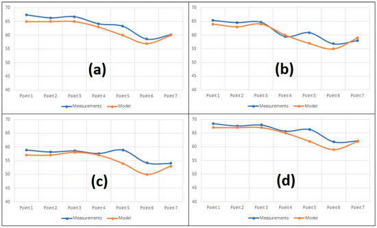 Comparing the values of the measurements with those of the model (without acoustic screen), the graphs shown in Figure 14 were obtained.