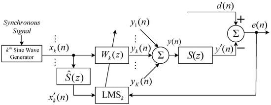 After each input signal is processed by its corresponding adaptive filter, the output signals are summed to obtain the antinoise signal . The weight vector is then updated by the filtered-X least mean square (FXLMS) algorithm [,],