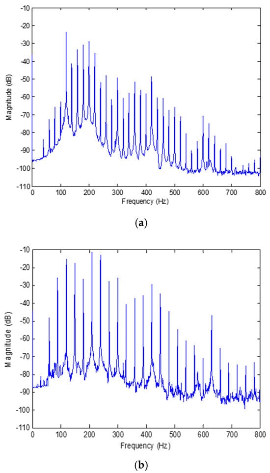 where N is the number of cylinders and r is the rotational speed []. Consider, for example, a four-cylinder automobile with a typical rotational speed of 2400 revolutions per minute (rpm); the fundamental frequency can be derived as and the separation between two consecutive harmonics can be derived as 20 Hz. For an automobile with a rotational speed of 3600 rpm, the fundamental frequency can be determined to be 120 Hz, and the separation between two consecutive harmonics can be derived as 30 Hz. In this study, we used the primary speaker of the electronic muffler to generate a series of sinusoidal signals associated with white noise from 0 to 800 Hz to mimic engine noise []. The sounds received at the error microphones are illustrated in Figure 4; the main harmonics were determined to be between 100 and 700 Hz. The vertical axis of Figure 4 is a plot of the voltages of error microphones on a decibel scale. These results obtained before and after activating the proposed NANC systems were compared to evaluate their effectiveness.