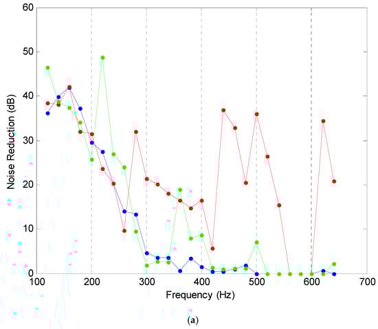 Figure 5a presents the noise reduction rate at each frequency for noise associated with the rotational speed of 2400 rpm. Clearly, the direct and the conventional direct–parallel systems could effectively reduce high-amplitude harmonics at frequencies below 220 Hz by approximately 30 dB; however, these systems were less effective for lower-amplitude harmonics at frequencies above 300 Hz. By contrast, the proposed direct–parallel system reduced the harmonics by more than 20 dB at most frequencies above 300 Hz. Its poor performance at frequencies of 420 and 560–600 Hz could be attributed to the poor magnitude response of the secondary path. The average noise reduction rates observed at each harmonic frequency for the direct, conventional, and improved direct–parallel NANC systems were 10.4, 12.8, and 22.3 dB, respectively.