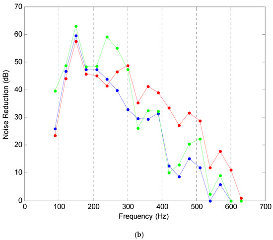Noise reduction in the direct (blue), conventional direct–parallel (green), and proposed direct–parallel (red) systems for (a) 2400- and (b) 3600-rpm noise.
