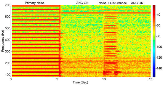 This study also investigated the effect of adding disturbances on the narrowband noise cancelation performance of the proposed direct–parallel system. The experimental setup is presented in Figure 6. An additional speaker was used to play a disturbance (2400-rpm noise) while the proposed system was activated to reduce 3600-rpm engine noise. This setup simulated the noise generated when another car passes by the noise-canceled vehicle. Figure 7 illustrates plots of the performance results; the horizontal axis denotes the time in seconds, the vertical axis (left) denotes the frequency of the noise and the vetical axis at the right represents the color of the noise power. The proposed direct–parallel NANC system was started reducing the 3600-rpm engine noise at approximately 5 s, and the disturbance (2400-rpm engine noise) was added at approximately 10–12 s. Clearly, the proposed direct–parallel NANC system effectively reduced noise despite the disturbance.